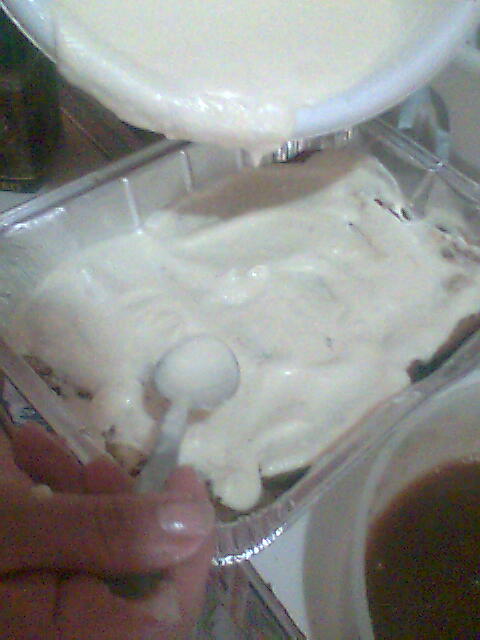 9.Ahora, colocas una capa de bizcochos en un molde y le aplicas una capa de la crema que hicimos y la espolvoreas de cacao en polvo.